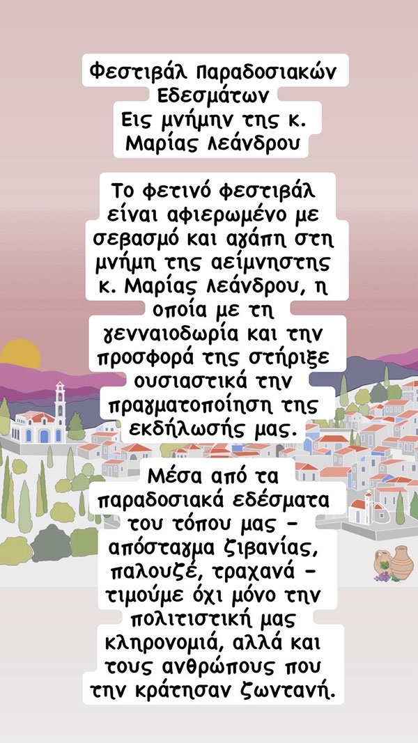 Το Κοινοτικό Συμβούλιο Κάτω Δρυ σάς προσκαλεί σε μια μοναδική μέρα γεμάτη παράδοση, γεύσεις και ζεστή φιλοξενία. Η εκδήλωση είναι αφιερωμένη στη μνήμη της αξέχαστης κ. Μαρίας Λεάνδρου, που με την προσφορά και τη γενναιοδωρία της στήριξε ουσιαστικά το φεστιβάλ μας.